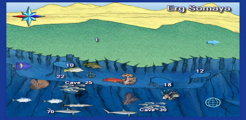 Там есть вертикальная стена, которая простирается на выступе этой вершины, достигающей до 5 метров ниже поверхности и «трансформируется» в другую стену, снабженную коралловыми скульптурами, одна из которых изображает пирамиды. Эрг Сомайя слегка подвержен атмосферному воздействию. Для более глубоких погружений рекомендуется быть опытным дайвером. Течение может быть сильными, и вы должны хорошо контролировать вашу плавучесть. Вы можете погрузится тут с причала или пойти на дрейф. Оба варианта обеспечат вам отличные ощущения. На северной части шельфа вы заметите, что крутая стена пересекается с выступающими кораллами. Они покрыты коврами горгонии и насыщенными по цвету мягкими кораллами. Эти башни известны своим фотогеничным внешним видом. Вокруг вершины есть наклонное песчаное дно. В нем проход в северо-восточном углу, при входе 30 метров на выходе 22 метра. Сама вершина начинается с 5 метров и ближе ко дну между 9 и 5 метрами, которая кишит богатой морской жизнью. Это обеспечивает хорошую остановку. Невозможно выйти, не посетив пещеру, покрытую горгонами и мягкими кораллами. Вершина Эрг Сомайя представляет собой раскол на шельфе, переполненный стеклянной рыбкой.Что Вас ждет погружаясь в Эрг Сомая